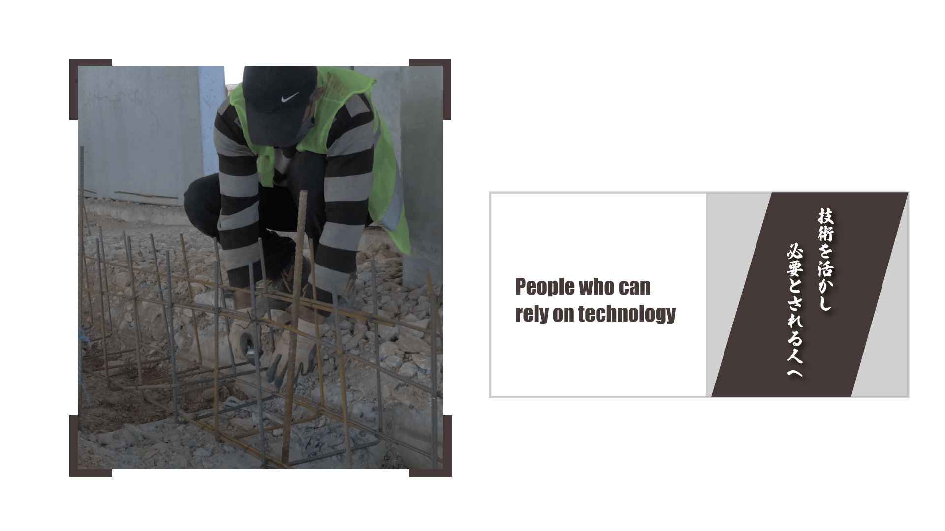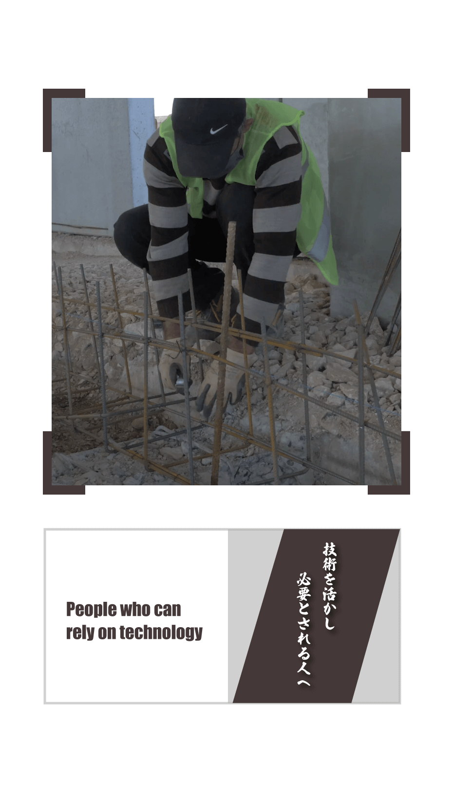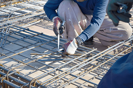 設計図から鉄筋の配置関係を把握し、現場に入ってきた資機材(鉄筋など)を設計図通りに組み立てる仕事です。 仕様書と図面を読める能力、配筋、段取りなどを経て、嵌合、結束でコンクリートを流し込む直前の骨組みを組むまでが仕事です。